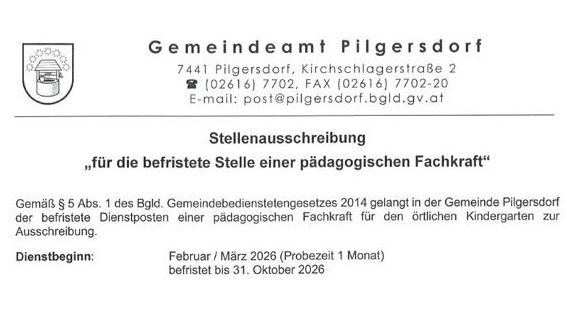 Die Gemeinde Pilgersdorf schreibt die befristete Stelle einer pädagogischen Fachkraft (Kindergartenpädagogin/Kindergartenpädagoge) für den örtlichen Kindergarten aus.